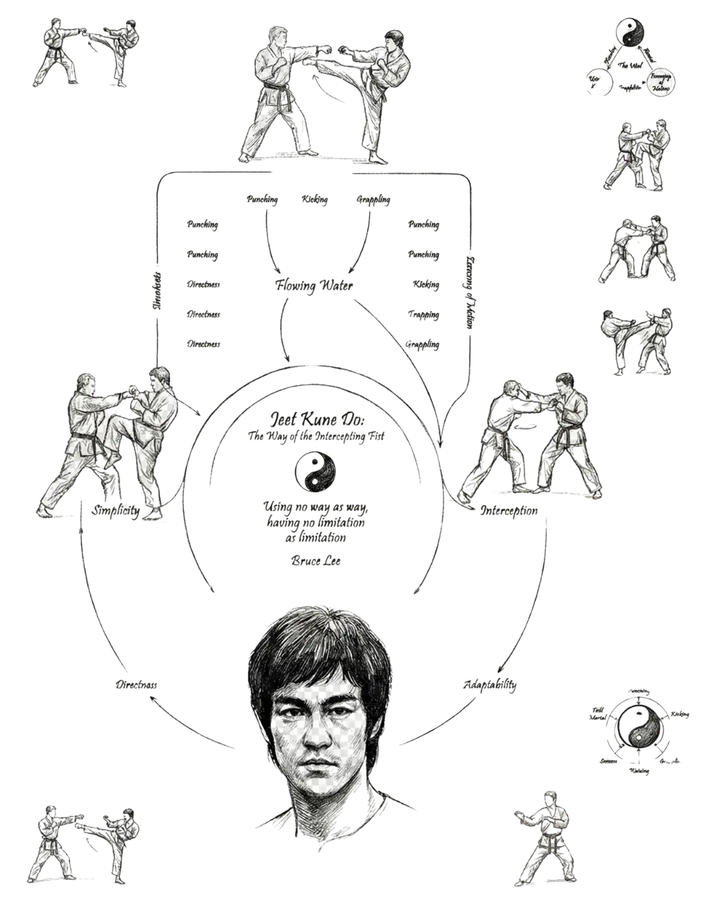 Jeet Kune Do translates to “The Way of the Intercepting Fist.” Bruce Lee created it as a philosophy of constant evolution — rejecting rigid styles in favor of what actually works for you.